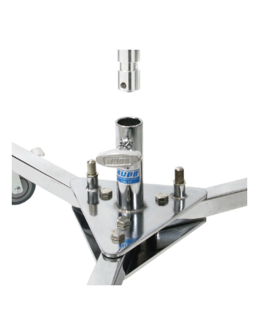 Base de stand pesada com rodas, construída em aço cromado, desenhada para máxima estabilidade em setups de iluminação e rigging. O design dobrável facilita transporte e armazenamento, mantendo a robustez necessária para utilização intensiva em set.